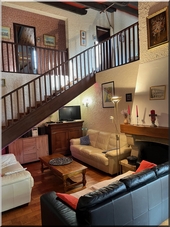 Mobilier : 2 tables chêne, 10 chaises chêne, bibus, bibliothèque, 3 canapés, table basse, commode, cheminée, TV écran plat réliée au satellite, chaîne Hifi DVD |